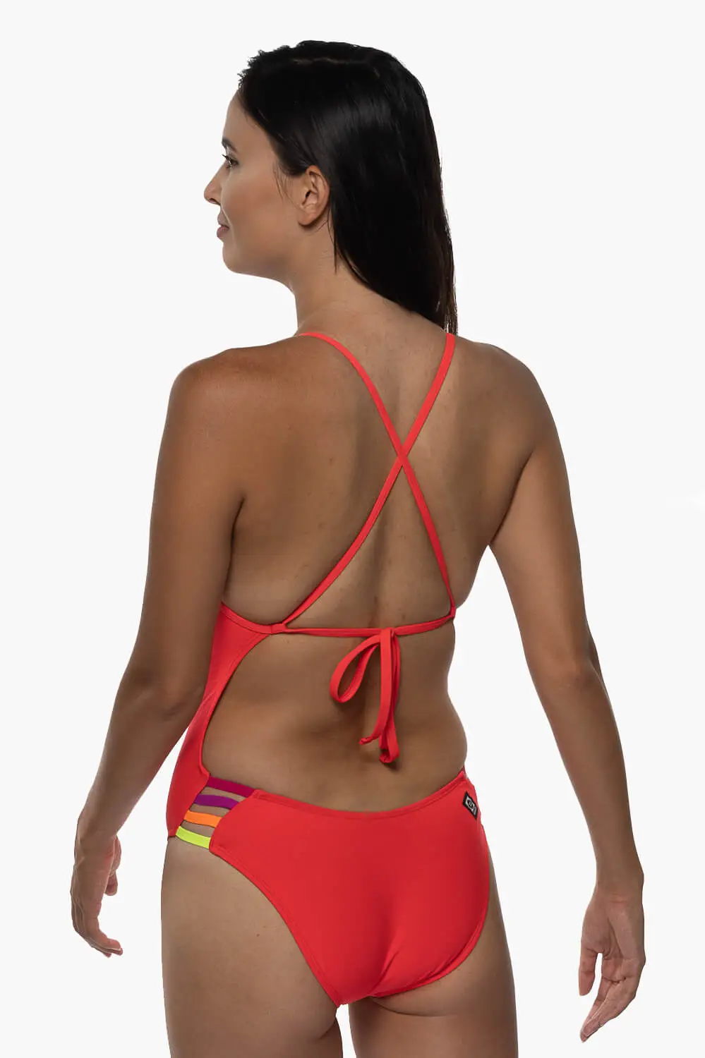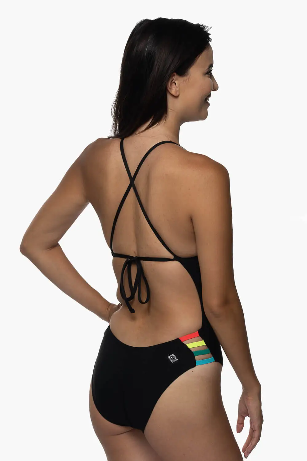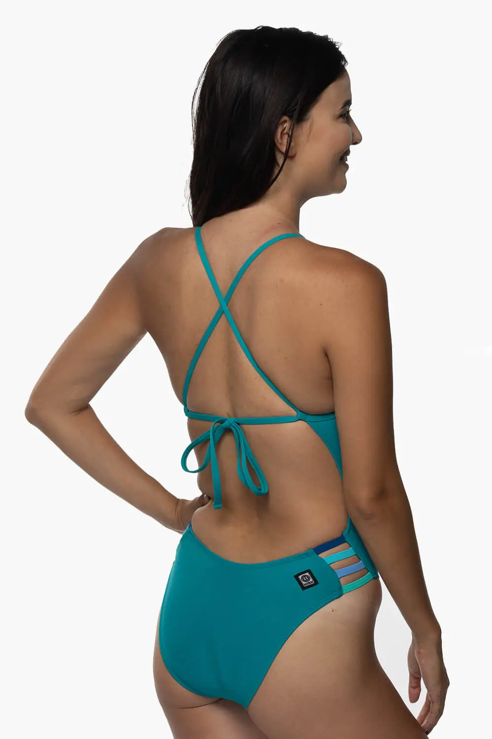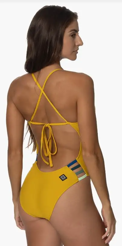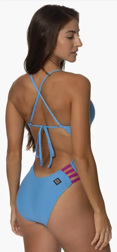 The Gavin is a tie-back swim onesie with a four-strap cut out detail on the hip. This swim onesie offers medium/full bum coverage and adjustable back straps, as well as sturdy fabric that stretches along the length of the body for easy movin’ during your workout. Â