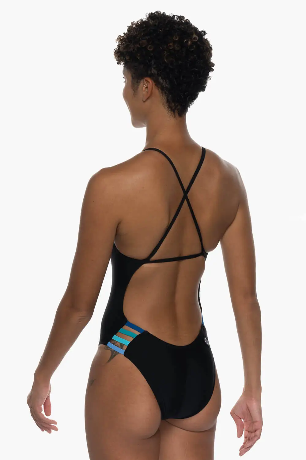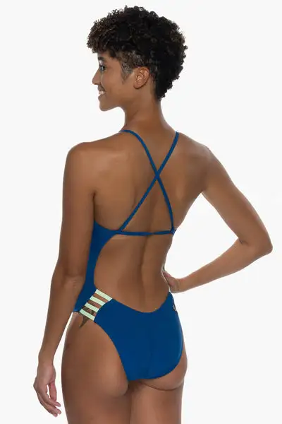 The Julian is a fixed-back one piece swimsuit with a criss-cross strap along the back and a four-band cut out detail along the hip. The strap is designed as one continuous band, which allows flexible distribution of tension along the shoulders and back during your water workout.