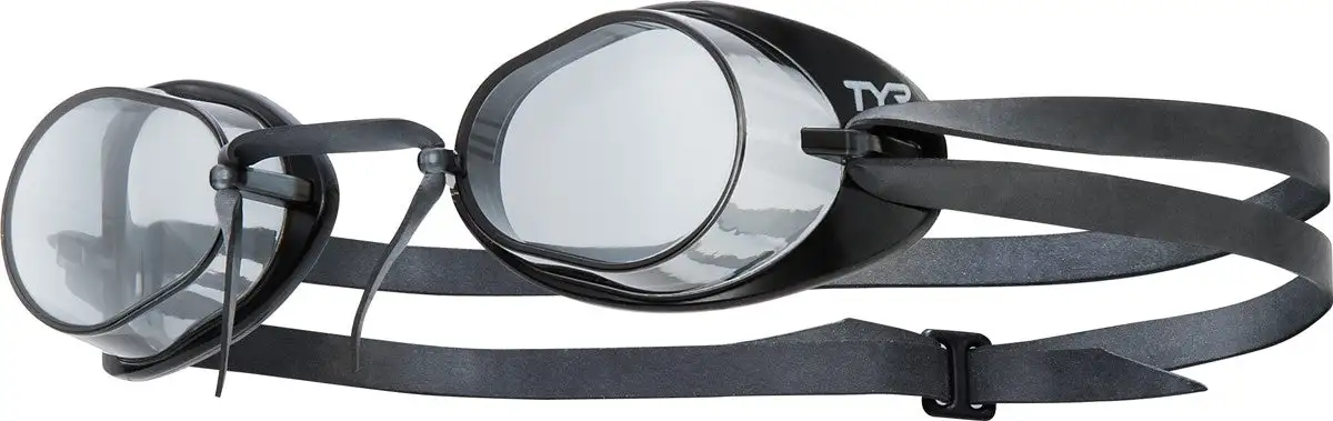 Low-profile, wide peripheral lenses. Close fit designed for minimal drag in competition. Socket seal gaskets: Swedish-style goggle with rubber seal for an extremely close, comfortable fit. Swedish-style adjustable nosebridges: rubber strap provides a flexible fit. String provides a rigid and secure fit. Double latex headstrap provides a low-profile, secure fit. UV protected and anti-fog coated lenses.